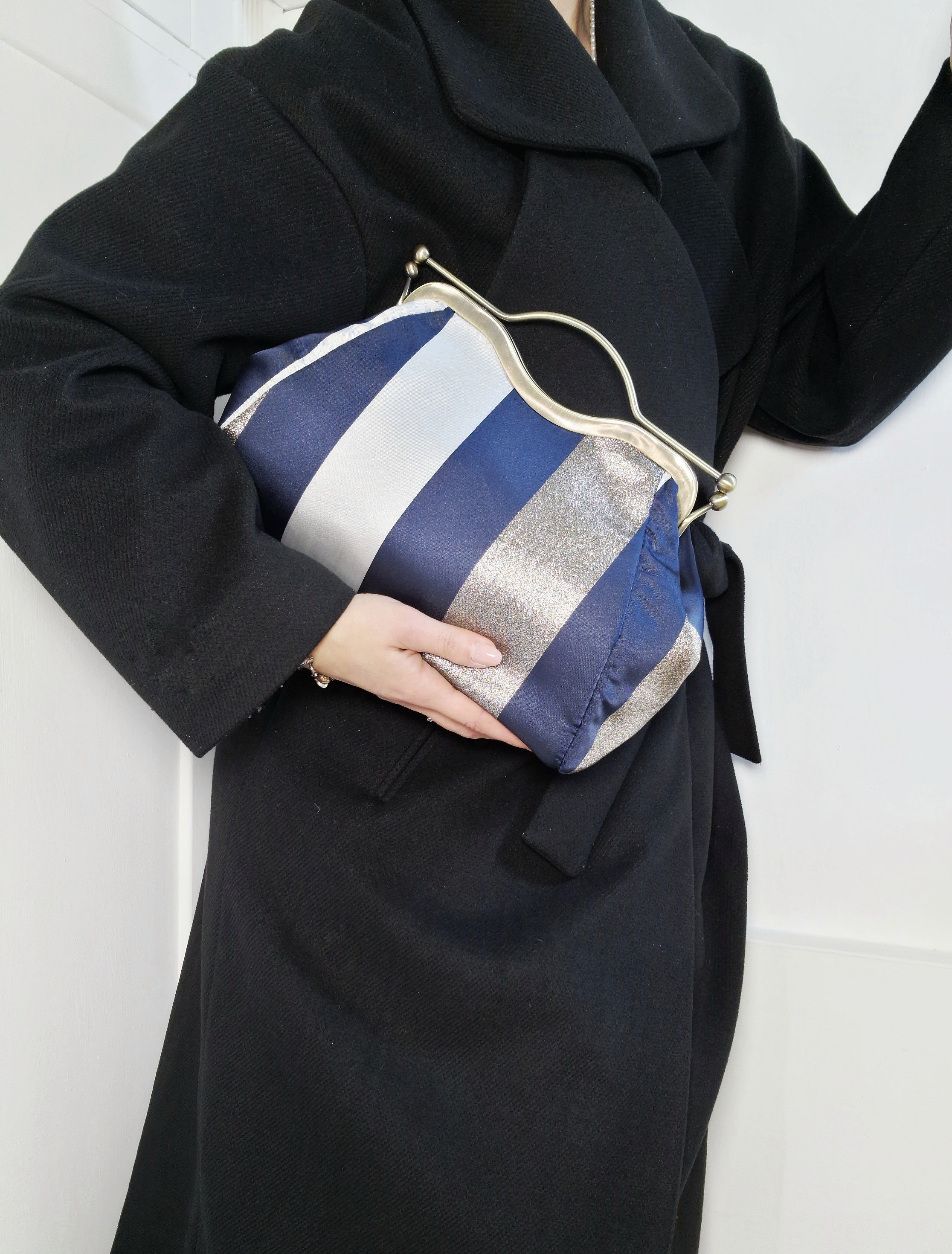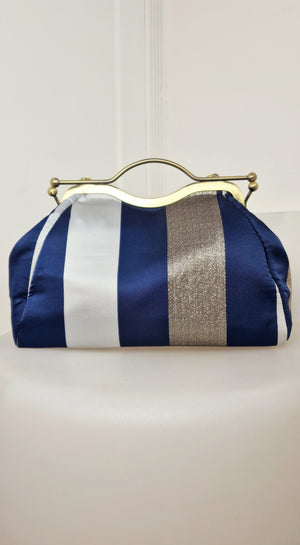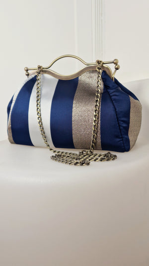 Borsa anni '50 a strisce blu-argento-bronzo lama. Manico in ottone con tracolla removibile