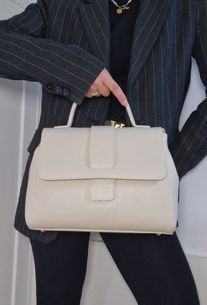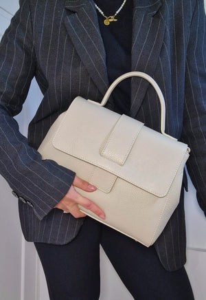Borsa in vera pelle con manico. Apertura con bottoni magnetici + zip. Tracolla removibile e regolabile.