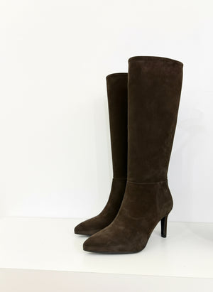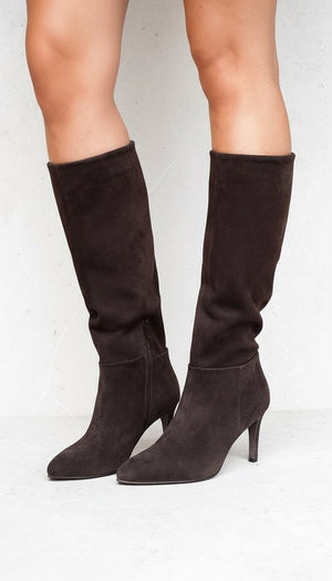 Questo stivale in camoscio CLOE di color cioccolato è perfetto per un look elegante e moderno. Con un tacco stiletto di 8 cm, ti garantirà una camminata sicura e femminile. La zip a metà gamba lo rende facile da indossare e da abbinare a molti outfit diversi.