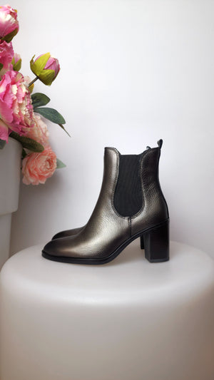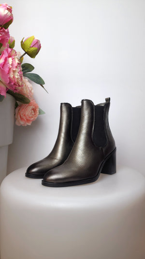 Stivaletto artigianale in vera pelle laminato bronzo,elasten su entrambi i lati. Tacco 8cm con plateau gommato e antiscivolo di 1 cm.