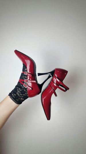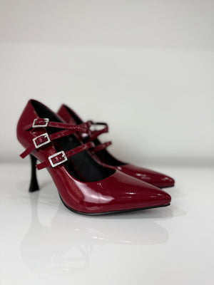 Scarpa dal design elegante e sofisticato di GAI MATTIOLO, con tre cinturini sul collo del piede regolabili per una calzata perfetta. Dettagli in micro strass e tacco a clessidra da 9 cm garantiscono un look femminile e raffinato. Disponibile in bordeaux verniciato, per un tocco di stile in più.