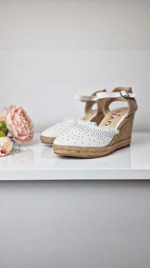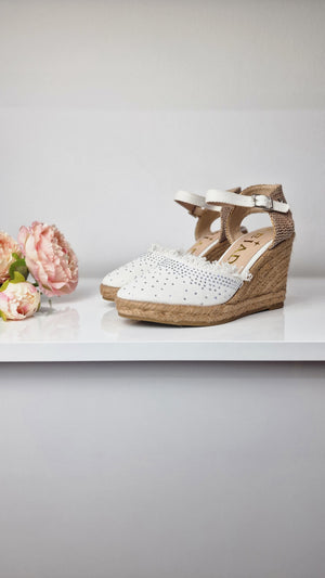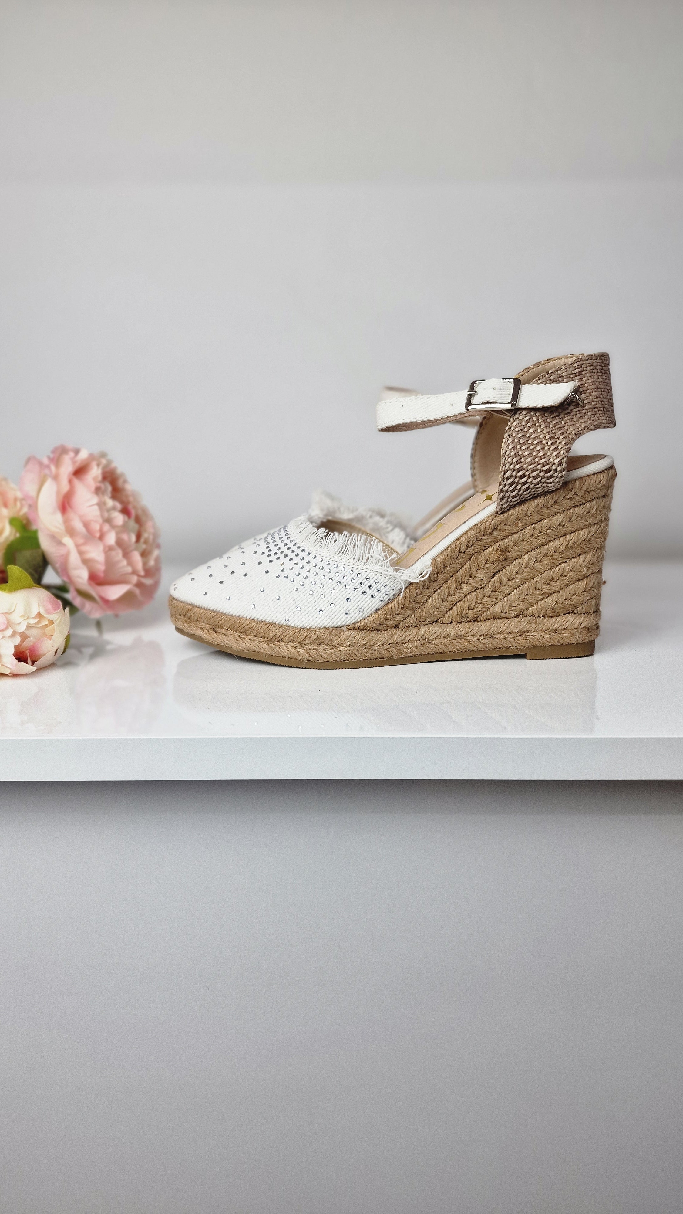 Lejade presenta le sue nuove espadrillas in denim bianca con dettaglio in strass, perfette per un look elegante e raffinato. La para di 9cm in corda garantisce un'ottima stabilità e comfort. Aggiungi un tocco di lusso al tuo outfit con queste espadrillas uniche e di alta qualità.
