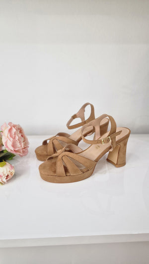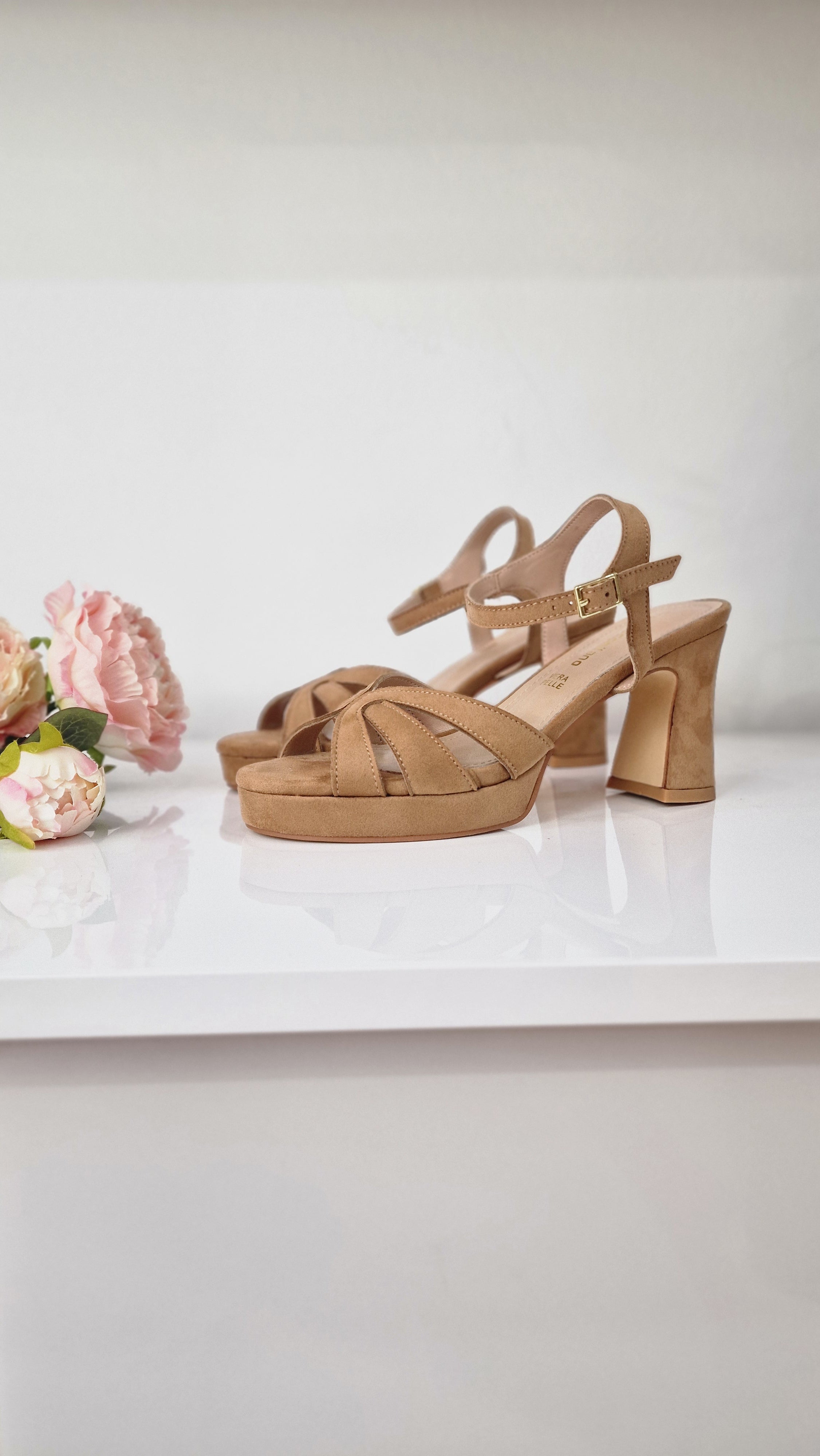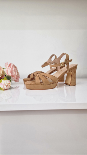 Morbido, femminile e deciso. Questo sandalo in camoscio marrone è un invito a camminare con sicurezza e stile. Le fasce intrecciate accarezzano il piede, mentre il plateau di 2cm anteriore e il tacco largo di 8cm garantiscono stabilità e slancio, anche per chi ama stare in piedi tutto il giorno. La nuance calda e neutra lo rende estremamente versatile, perfetto sia per look da giorno che per occasioni serali più rilassate. Un modello che sa adattarsi, senza mai passare inosservato.