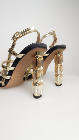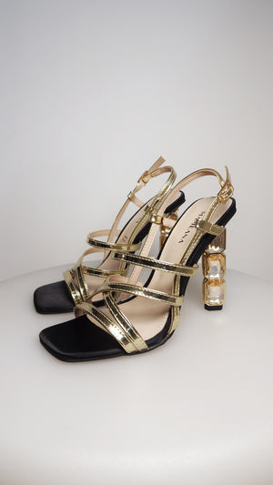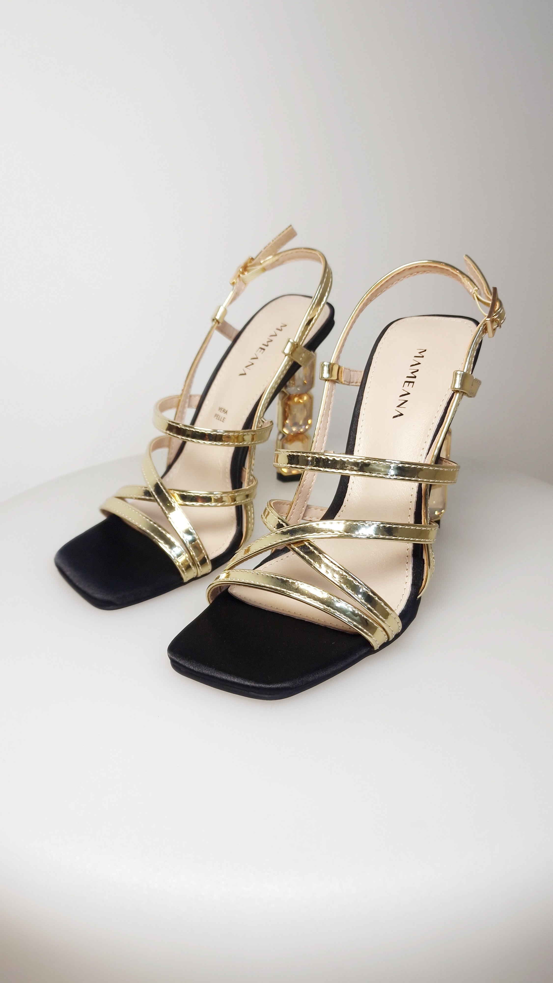 I sandali Mameana presentano delle stringhe dorate effetto specchio ed il sottopiede in raso nero, rendendoli versatili ad ogni outfit. Il tacco gioiello da 11 cm e la plateau di 1 cm assicurano un'eleganza senza pari. Ideali per qualsiasi occasione.