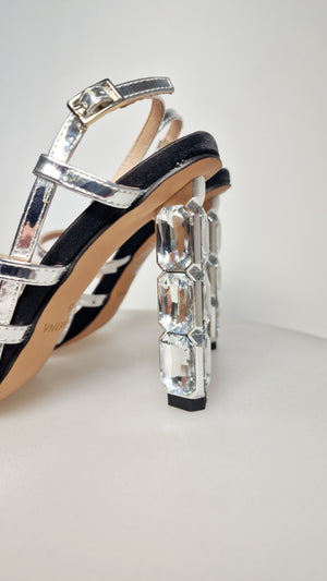 I sandali Mameana presentano una struttura argento effetto specchio ed il sottopiede in raso nero, rendendoli versatili ad ogni outfit. Il tacco gioiello da 11 cm e la plateau di 1 cm assicurano un'eleganza senza pari. Ideali per qualsiasi occasione.