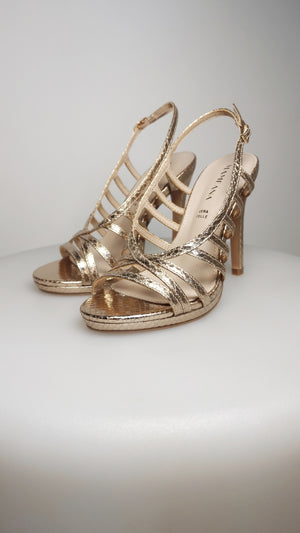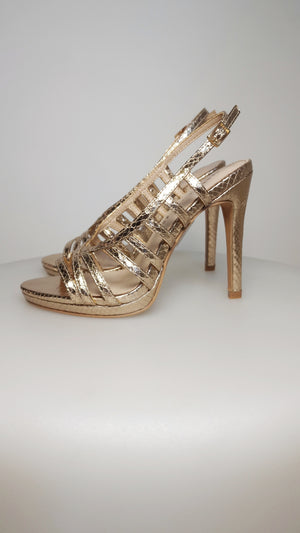 Sandali in oro rosa in pelle stampato pitone. Tacco 11 cm con plateau di 1 cm. Soletta in memory foam