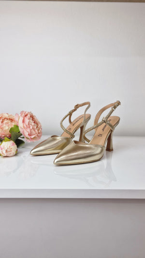 Aggiungi un tocco di eleganza al tuo guardaroba con le nostre slingback in satinato oro. Il tacco di 8,5cm, accompagnato da un plateau interno di 1cm, offre un'estetica slanciata, mentre il cinturino in microstrass sul collo del piede aggiunge un tocco luminoso. Perfette per ogni occasione.