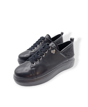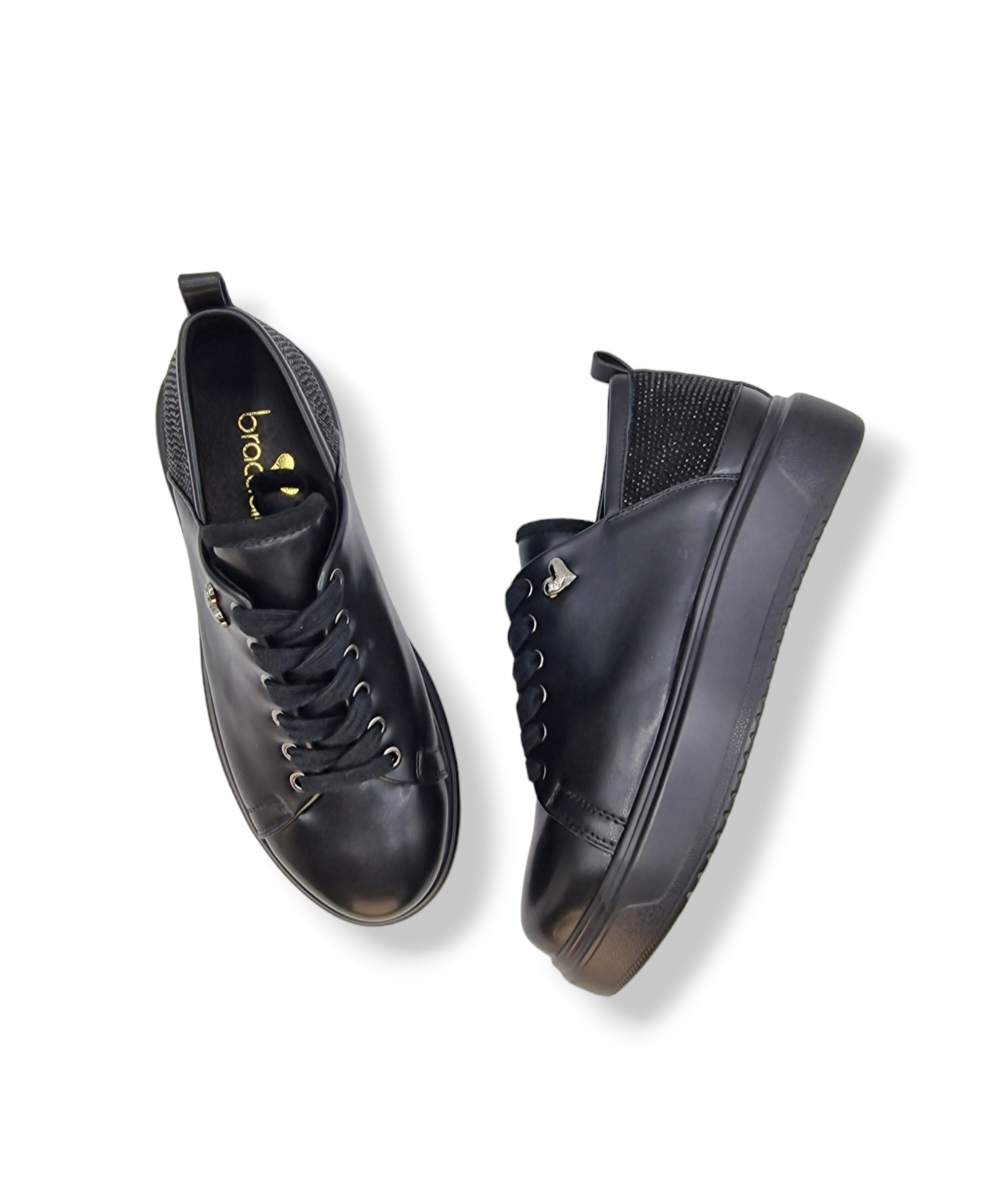 Le sneakers nere di BraccialiniShoes si caratterizzano per la loro comodità,hanno un'altezza della para bianca di 4 cm, un rialzo interno in memory foam di 1 cm e un dettaglio glamour di micro strass sul retro. Una scelta perfetta per un look casual chic.