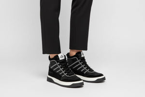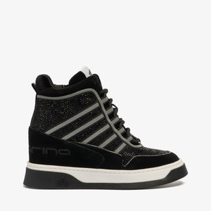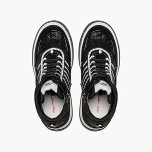Total black con strass, dettagli a contrasto, zeppa interna di 6 cm e allacciatura in stile pugile. Le sneakers high-top donano al look un perfetto twist urban.