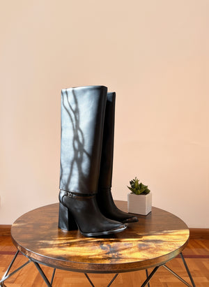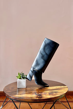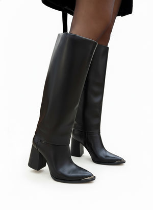 "Stivali con gambale alto e tacco 9 cm per un look sofisticato. Pratica zip laterale e punta metallizzata. Ideali per ogni occasione grazie alla loro versatilità e stile senza tempo."