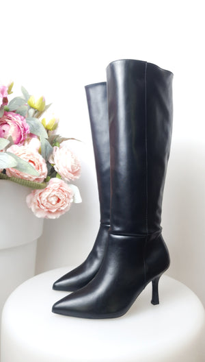 Stivali in simil pelle nero.Zip laterale interna.Tacco 8cm. Suola in gomma antiscivolo.