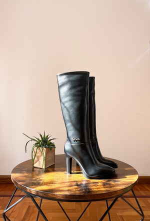 Gli stivali neri di Gai Mattiolo con gambale alto, zip laterale, tacco di 11 cm e plateau di 1 cm sono la scelta perfetta per un look elegante e sofisticato. La loro altezza dona slancio alla figura, mentre il tacco e il plateau garantiscono comodità e stabilità. Un must-have per questo inverno.