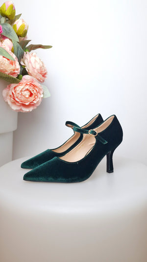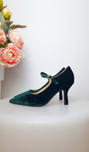 Décolleté in velluto verde con cinturino su collopiede. Tacco a clessidra di 8cm.