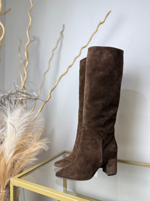 Questi stivali in camoscio idrorepellente color cioccolato sono l'ultimo must-have per ogni donna elegante. Dotati di un comodo tacco di 7cm e di una pratica zip laterale a metà gamba, questi stivali sono il perfetto connubio tra comfort e stile. Ideali per ogni occasione, da indossare sia di giorno che di sera.
